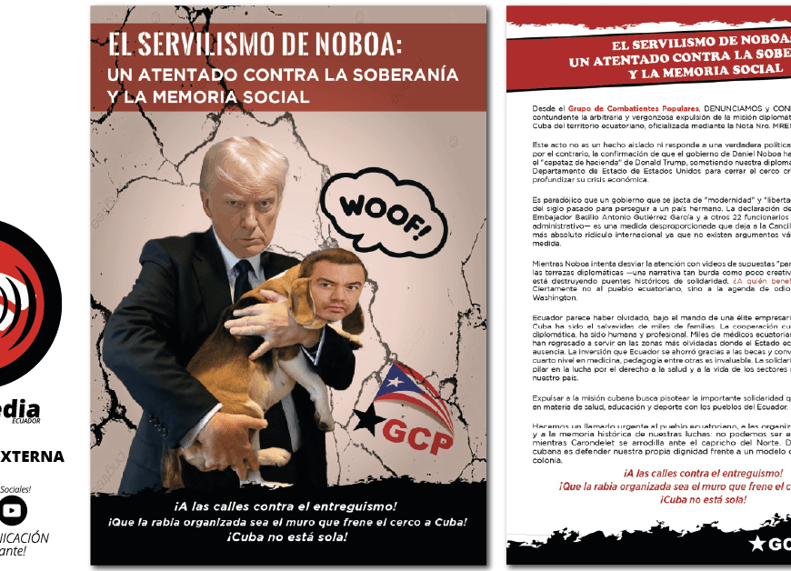 Publicación externa enviada a nuestro correo: indymediaecuador@riseup.netContacto con el autor: floranahipuebla@atomicmail.ioDesde el Grupo de Combatientes Populares, DENUNCIAMOS y CONDENAMOS de manera contundente la arbitraria y vergonzosa expulsión de la misión diplomática de la República de Cuba del territorio ecuatoriano, oficializada mediante la Nota Nro. MREMH-DCP-2026-0002-N Este acto no es un hecho aislado ni responde a una verdadera política exterior soberana. Es, por el contrario, la … Continúa leyendo EL SERVILISMO DE NOBOA: UN ATENTADO CONTRA LA SOBERANÍA Y LA MEMORIA SOCIAL