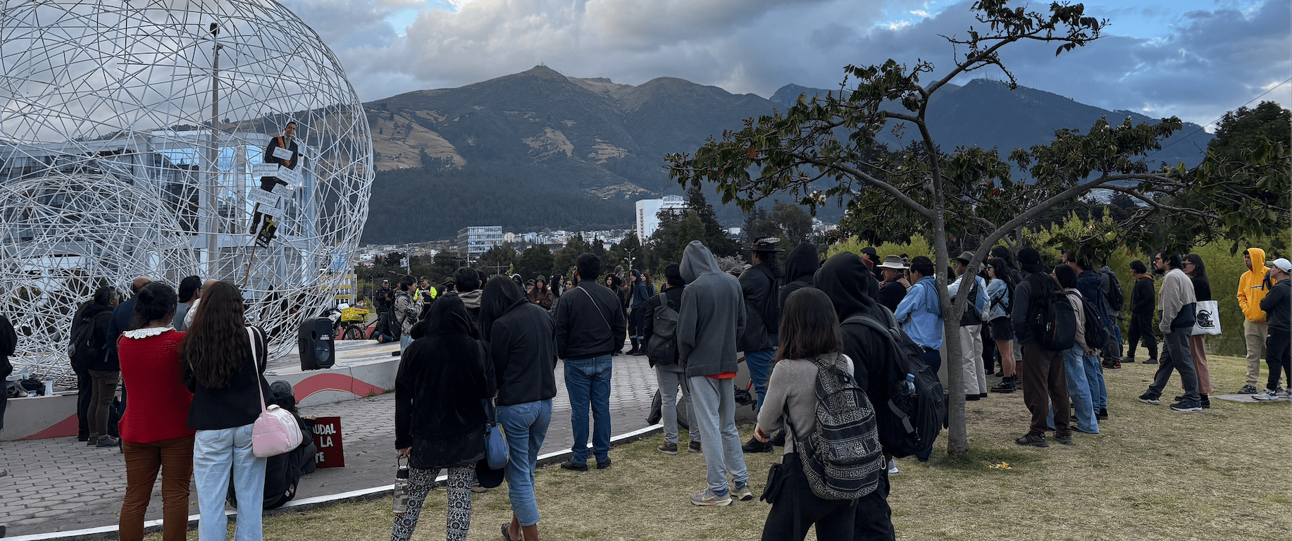 El aire de la tarde aún conservaba el calor del día, pero la verdadera temperatura subía entre las conversaciones de molestia frente a las acciones de Noboa. Una a una, comenzaban a llegar las personas. Tal vez éramos pocos, sí, la autoconvocatoria rara vez reúne multitudes desde el primer momento, pero el hartazgo y la rabia se sentían densos, palpables en cada mirada, en cada gesto. ¿Que éramos pocos? Claro, ¿quién podía esperarse lo contrario? A las cuatro de la tarde, muchos apenas están terminando su jornada laboral, o quizás a las cinco, o incluso más tarde para quienes contaban con la «suerte» de tener un trabajo en estos tiempos. La vida apremia antes que la protesta, pero la protesta se gesta en la propia precariedad de esa vida.